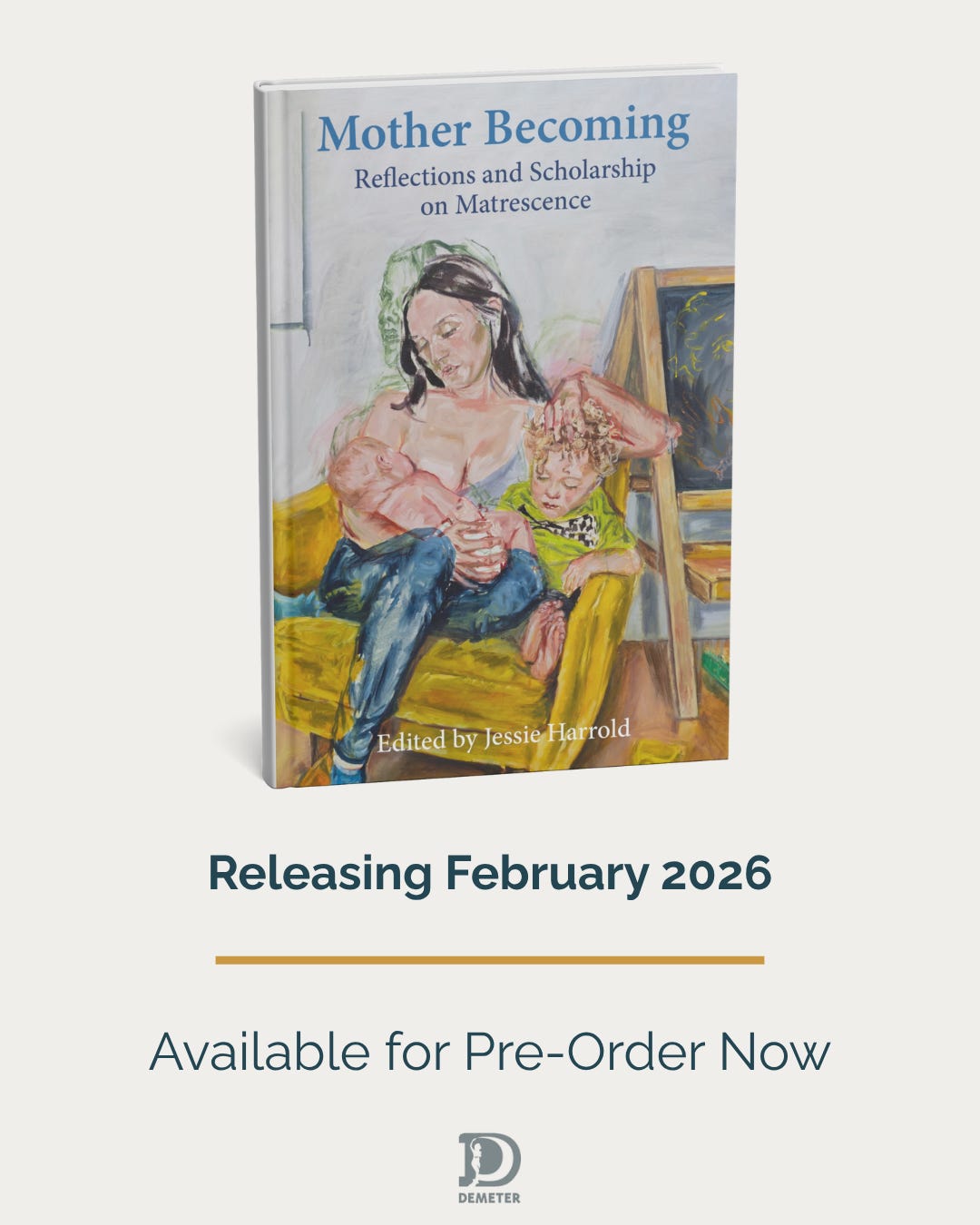 𓇸 I’m so excited to share that an essay I wrote on ‘Interruption in motherhood’ will be published in a collection titled Mother Becoming: Reflections and Scholarship on Matrescence, edited by Jessie Harrold and published by Demeter Press next February. Through scholarship and storytelling alike, Mother Becoming unearths the multidimensional, kaleidoscopic nature of matrescence while also highlighting research, policy and practice recommendations to better support mothers. There are a total of 22 incredible contributors to the book, including fellow Substack writers Sarah Pedersen, Genevieve Beech and Devon Parish. It was a joy to write this piece and I’m so excited to see it come into the world early next year. You can preorder copies via THIS LINK with a 20% discount using code MOTHERS.